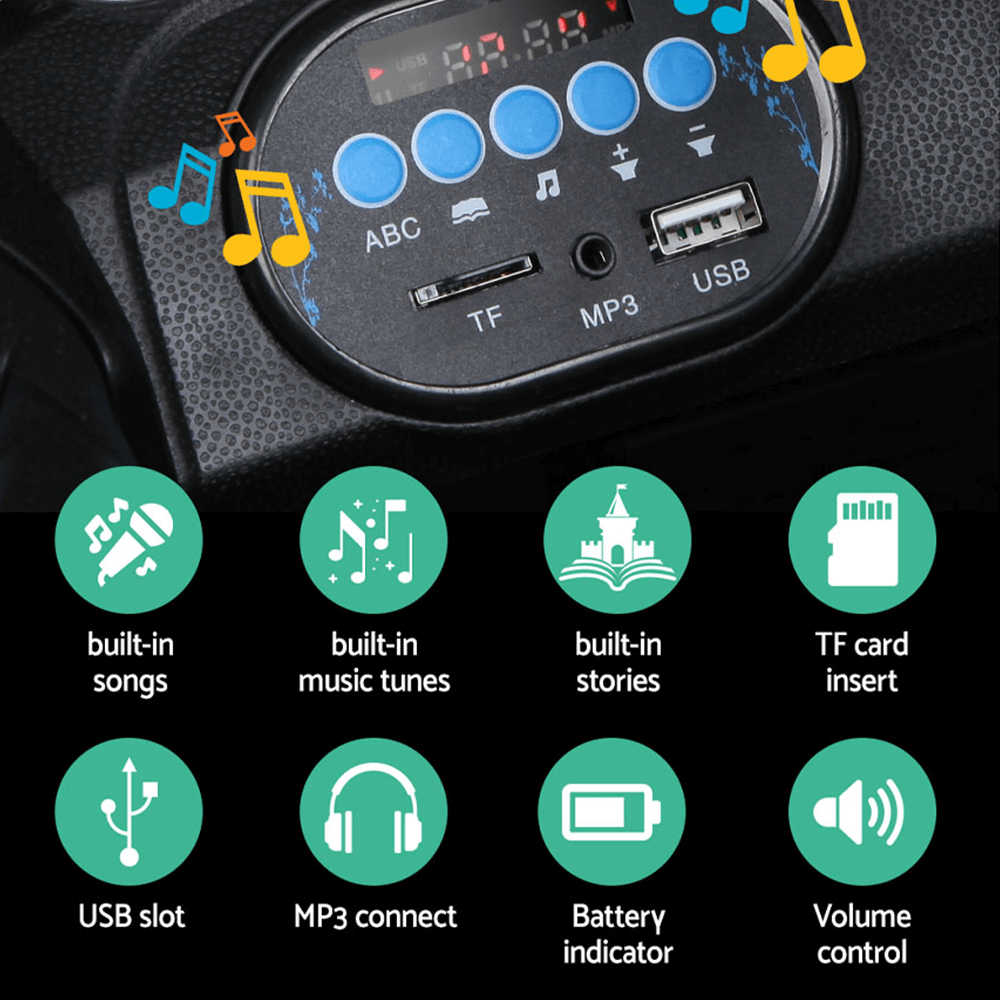 With its aesthetics, performance, and charm, the Audi TT RS ride-on car is sure to wow your little driver. It has an iconic marque, a brilliant finish that emphasizes its sculpted lines, and a sturdy build. It includes powerful twin motors for exciting performance and a thrilling ride, premium anti-slip tyres for a smooth ride, and a large seat with a safety belt for safety and comfort. It also boasts elegant functional doors, dynamic lighting for illuminating presence and reverse lights for safety, and a dashboard with built-in music, stories, USB slot, battery indicator, MP3 connect, and volume control for a realistic driving experience.