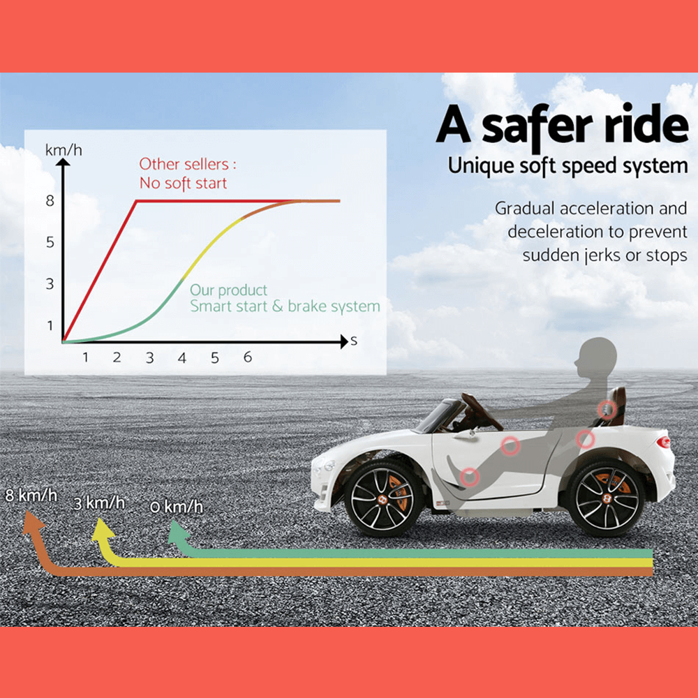 Step on the accelerator and the twin 50W motor gives the ride a simply exhilarating send-off. The four-wheel suspension and anti-flat design tyres ensure the ride absorbs all impacts for a stable cruise along grass, concrete or any coarse surface. Together with the wide sport seat, seat belt and an adult remote override control, the unique soft speed system also adds to the safety-first motto of this fun Kids Ride On Car.