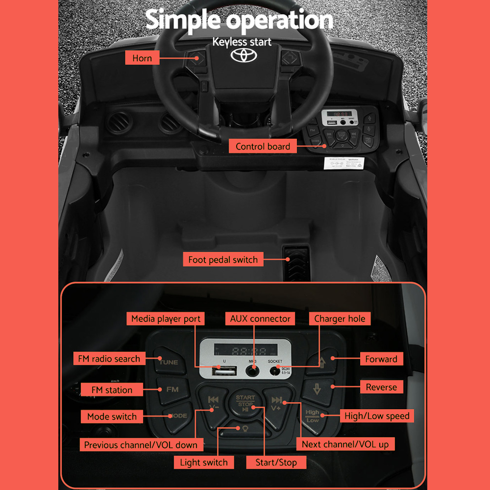 Safety is paramount with the Toyota Tacoma Ride-On. It includes a safety seat belt and a remote control for parental supervision, allowing parents to take over the car's controls from up to 20 metres away for added security.