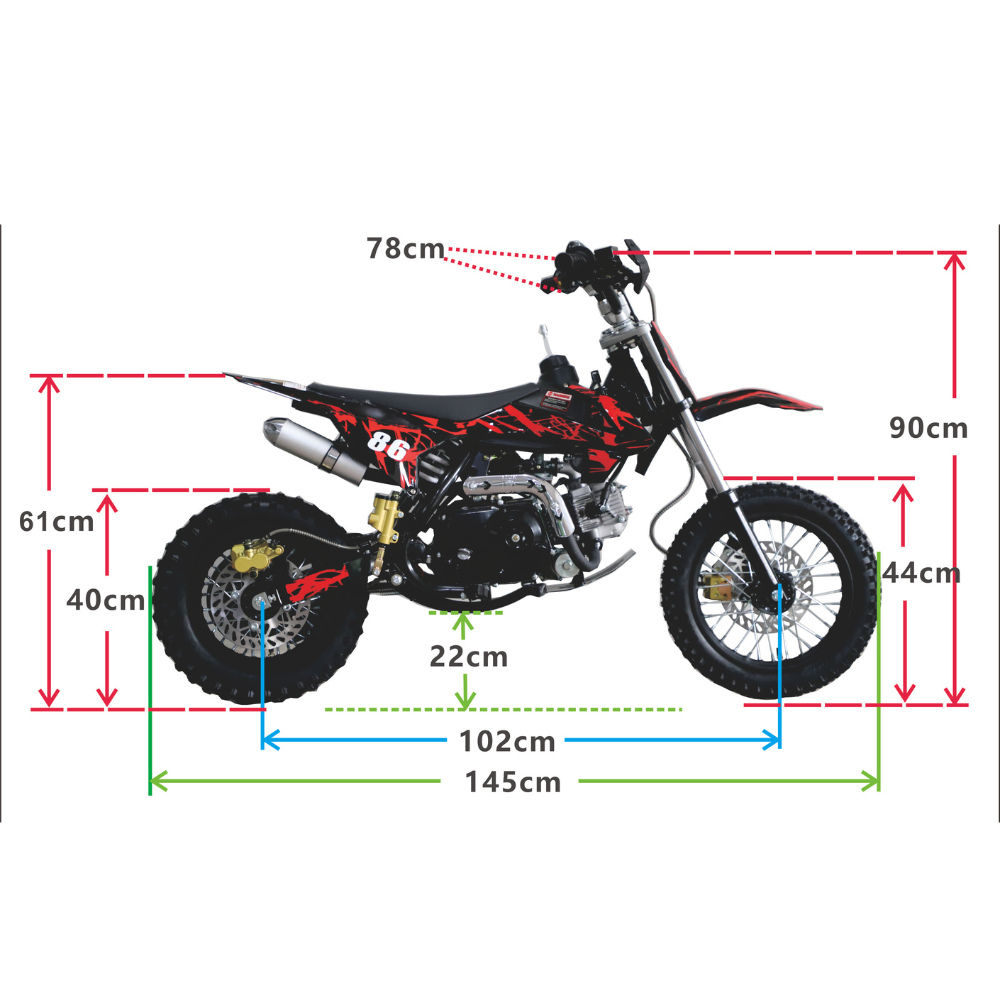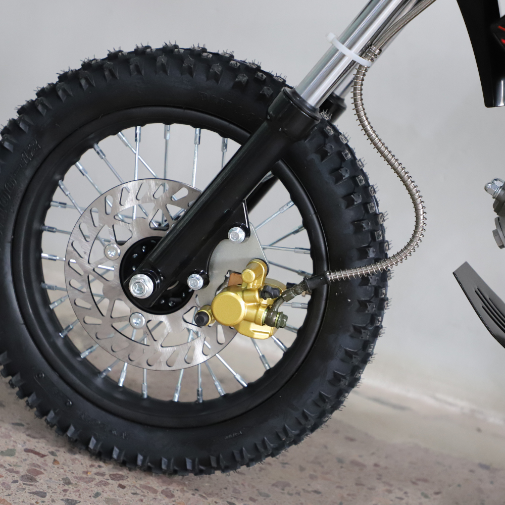 The new 50cc Motoworks Dirt Bike has heavy-duty front and rear hydraulic disc brakes for supreme stopping power when needed! With the wide front wheel and wheels in the rear, this medium-sized dirt bike can tackle the most extreme terrains. It's got a maximum speed of 50km/hr (depending on the terrain surface) which makes it ideal for big open roads or just exploring your local neighbourhood!