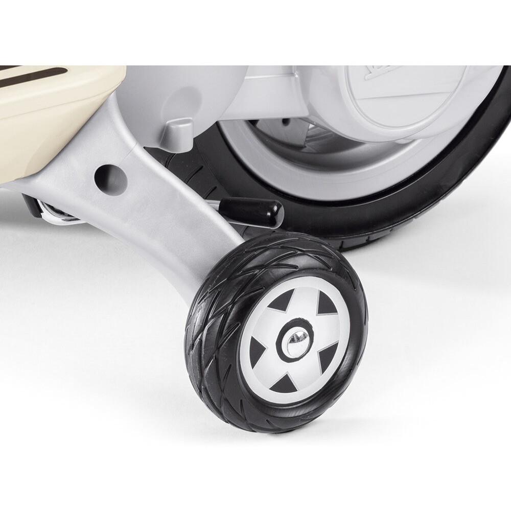 The Peg Perego Vespa is packed full of comforts and features such as the large and cosy seat, the rear object holder that also functions as a backrest that can be removed to leave space for a strong baggage rack. A large footrest accommodates any driving style. The look of the stabiliser wheels fits perfectly with the design. They are perfect for small children who are still a little unsteady and can be removed when your child has acquired the necessary balance. The rubber tyres offer exceptional grip and the large mudguards protect from the spray. The iron kickstand is very strong and durable. The headlights are all reflective of natural light.