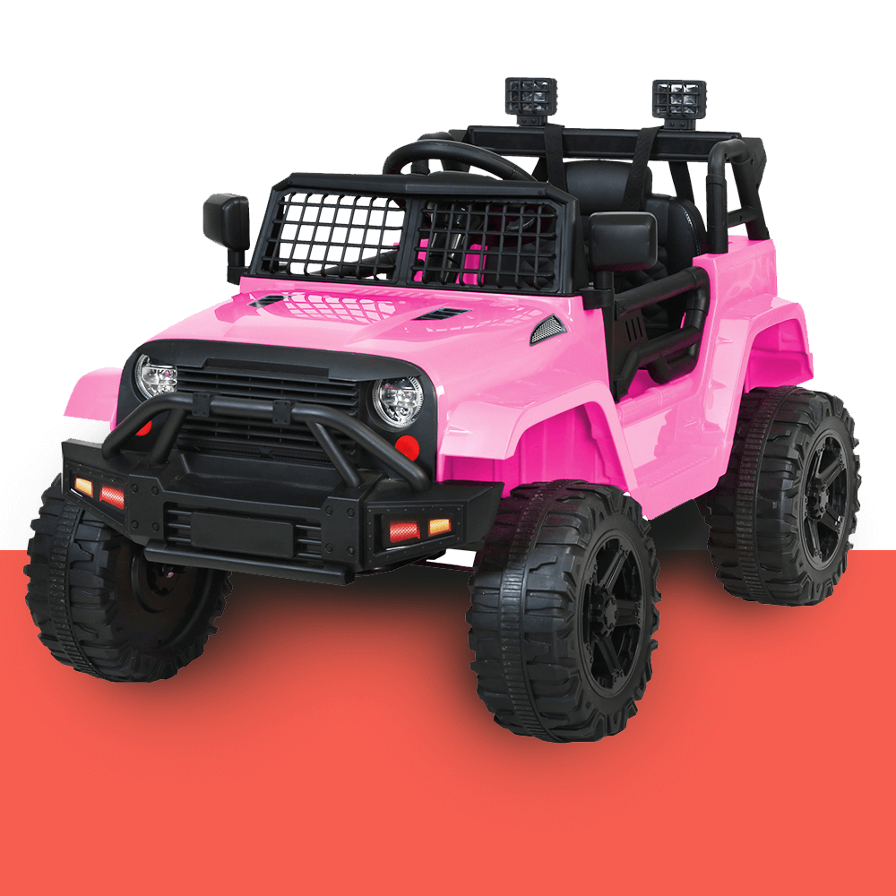 With its aesthetics, performance, and charm, our off-road ride on jeep is guaranteed to please your young driver. It has a fantastic and distinct outer design, a gorgeous lacquer finish that emphasizes its sculpted lines, and a sturdy build. You can also choose between a black, pink, red, or white jeep.