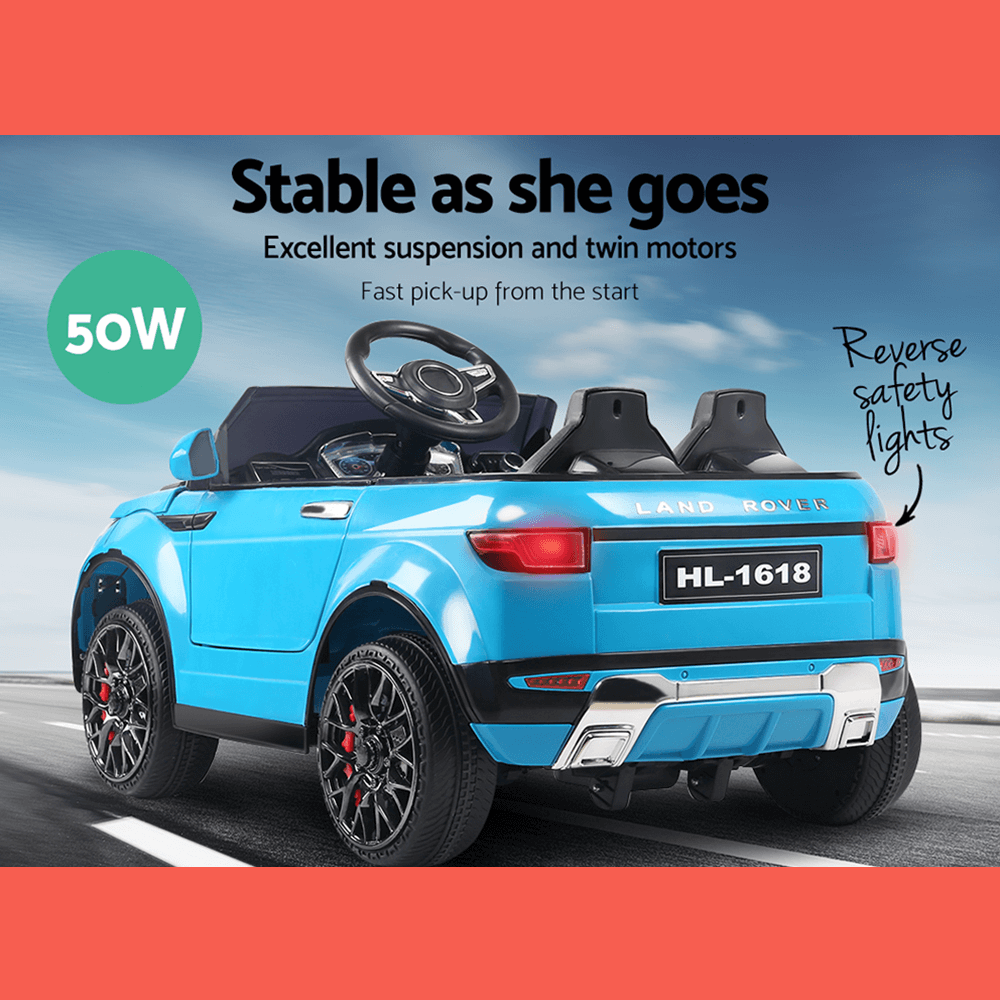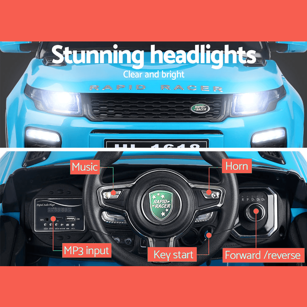 With its looks, performance, and charisma, the Range Rover Evoque inspired kids electric ride on car's beautiful design is sure to impress your little driver. It has the same features offered on many upscale, luxurious cars such as a dynamic and distinct exterior design, a brilliant lacquer finish, and sturdy construction. This ride on car comes in black, blue, orange, and white models and features powerful twin motors for exhilarating performance and thrilling rides, 4-wheel suspension for shock absorption and ultimate comfort, premium non-slip tyres, and a spacious seat with an adjustable safety belt for safety and comfort. It also has stylish working doors, stunning headlights and reverse lights, and a digital dashboard with functions such as horn, music, key start, and accelerator pedal for a redesigned driving experience.