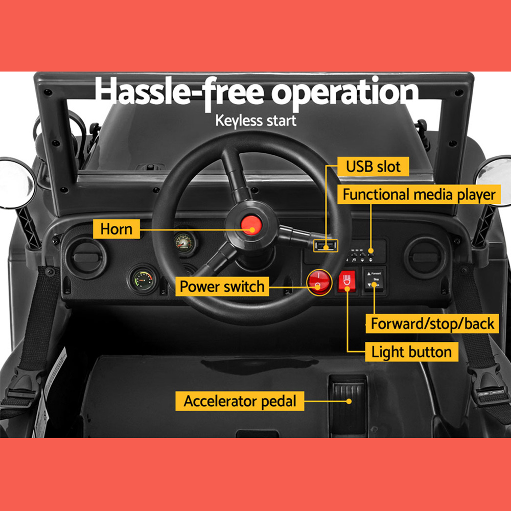 Get ready for hours of fun and adventure with the Rigo 12V Kids Military Jeep Off Road Ride On Car with Remote - Black. Perfect for young thrill-seekers, this stylish black jeep promises endless outdoor excitement. Order now and watch your child's face light up with joy!