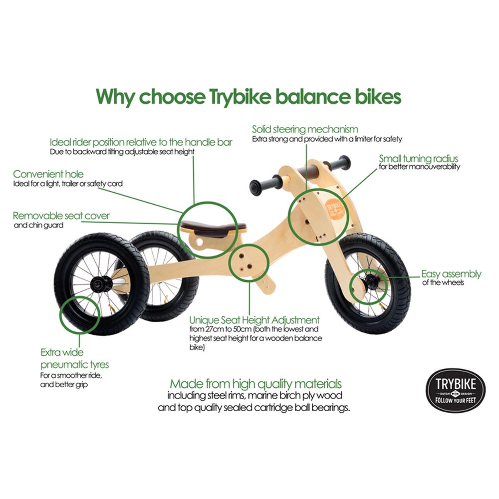 This trybike has been made using high-grade components and its birch frame is both sturdy and lightweight. The pneumatic tyres ensure a smooth ride regardless of the terrain. Whereas the wide saddle seat and chin protector cushion adds to the comfort and experience of riding this bike. This bike is quite easy to assemble and transform with the most simple tools(also included in the package).